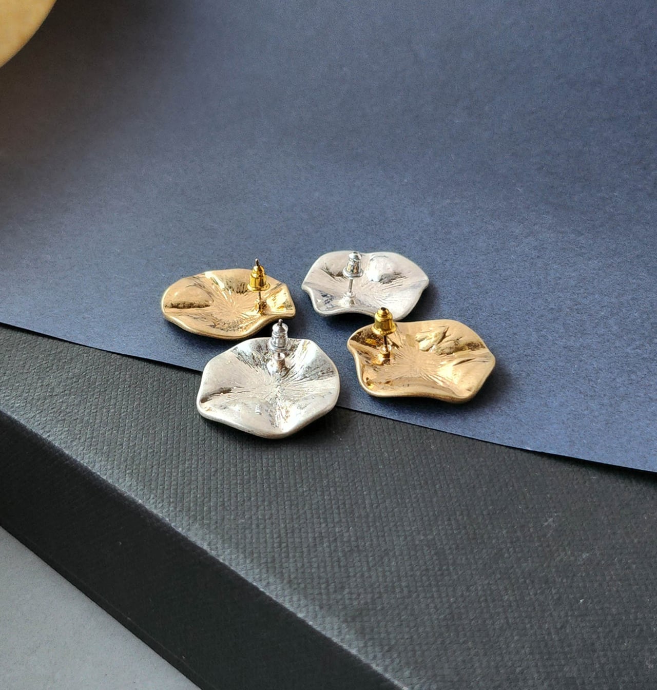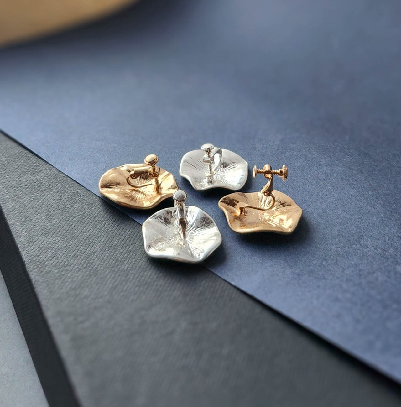 円形のプレートに施されたいびつな凹凸が、くしゃっとした花びら(=ペタル)のようなデザインでお洒落なピアス/イヤリング。